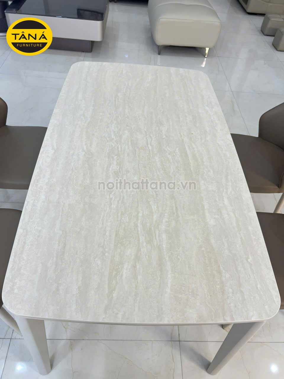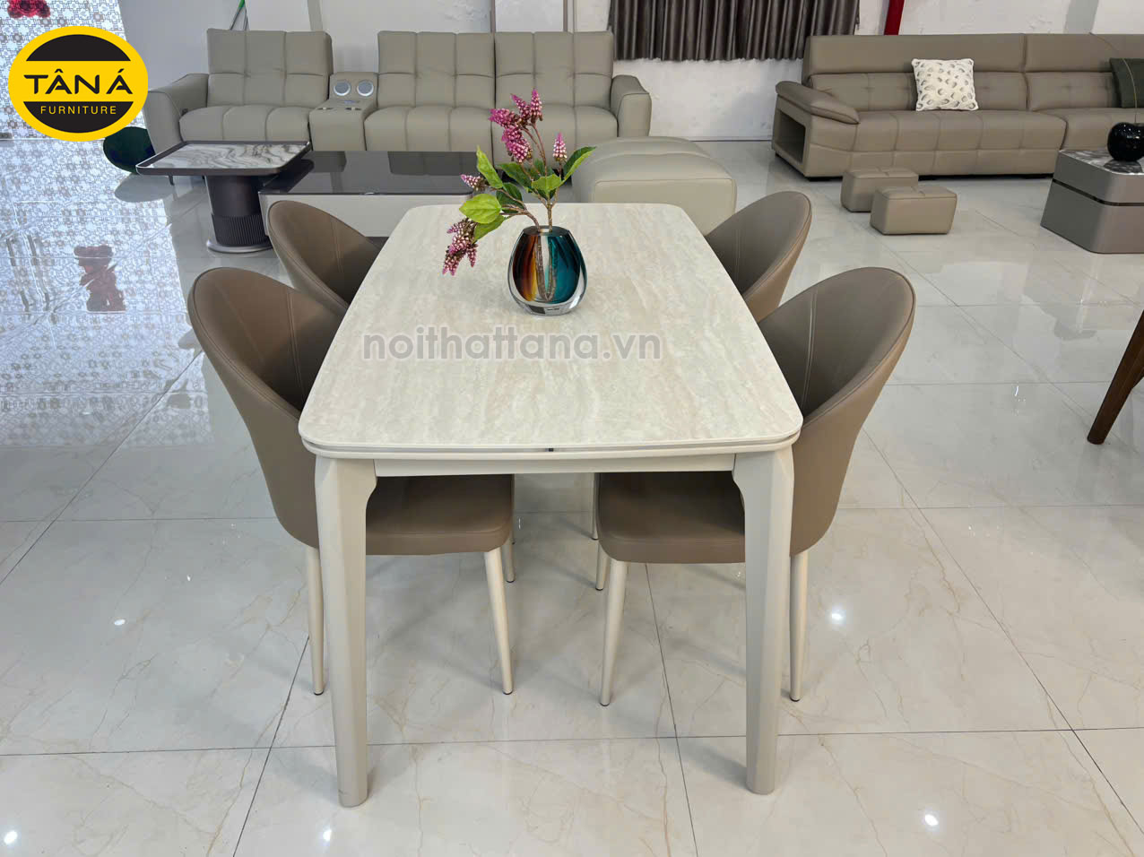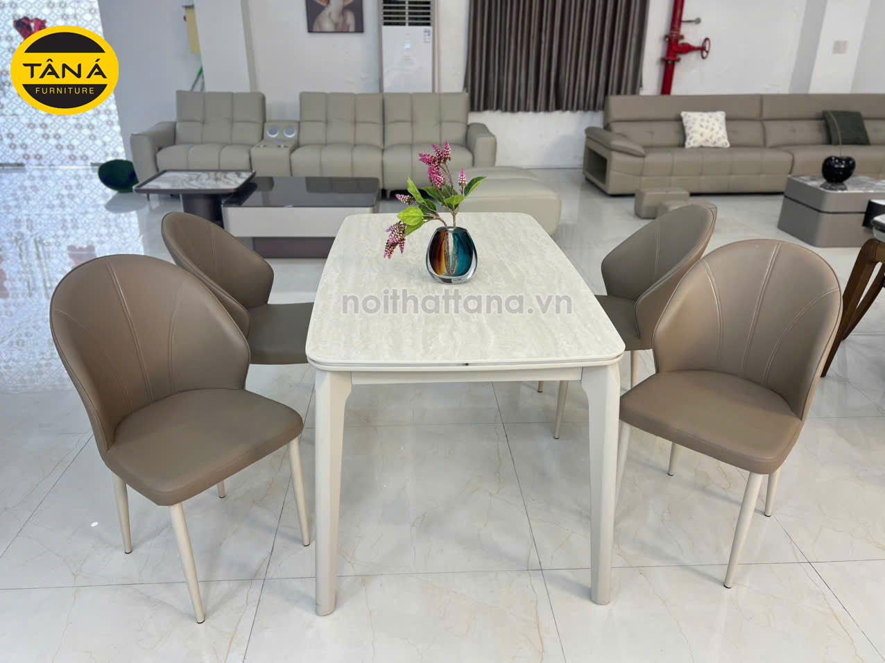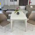 Bộ bàn ăn được thiết kế theo phong cách tối giản – hiện đại, màu sắc trung tính sang trọng.