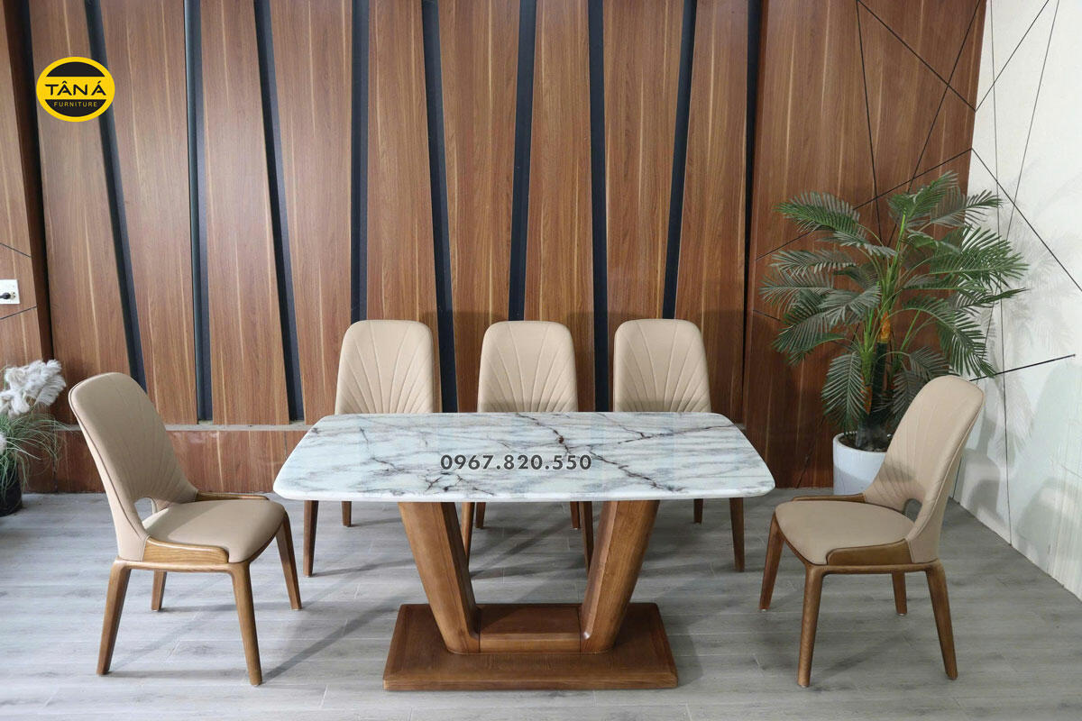Bộ Bàn Ăn 1M6 Mặt Đá Tự Nhiên 6 Ghế Gỗ Sồi Nhập Khẩu BA246