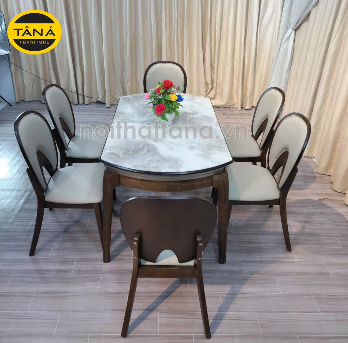Ngoài ra, 6 ghế được làm từ chất liệu da cao cấp bền, màu sắc nhã nhặn cùng tone màu với mặt bà. Sự kết hợp hoàn mỹ giữa các chất liệu tạo ra tuyệt phẩm làm điểm nhấn giúp nâng tầm không gian phòng ăn. Bạn hoàn toàn có thể kết hợp mẫu bàn ăn này với bất kỳ phong cách thiết kế nào cũng giúp tôn lên được giá trị của tổng thể không gian sống.