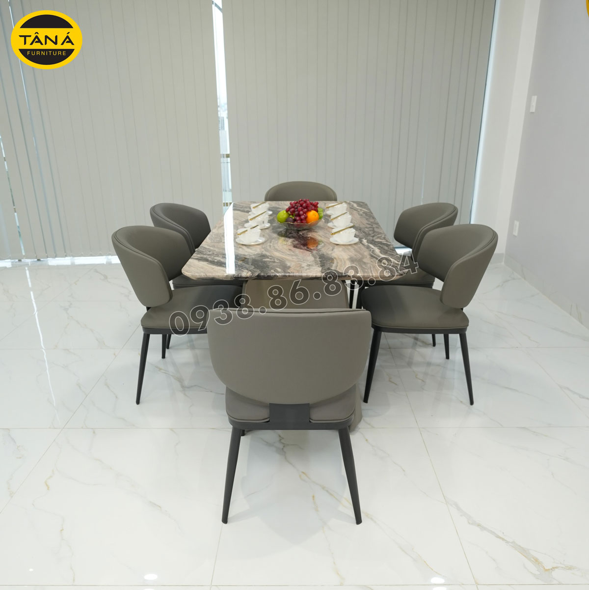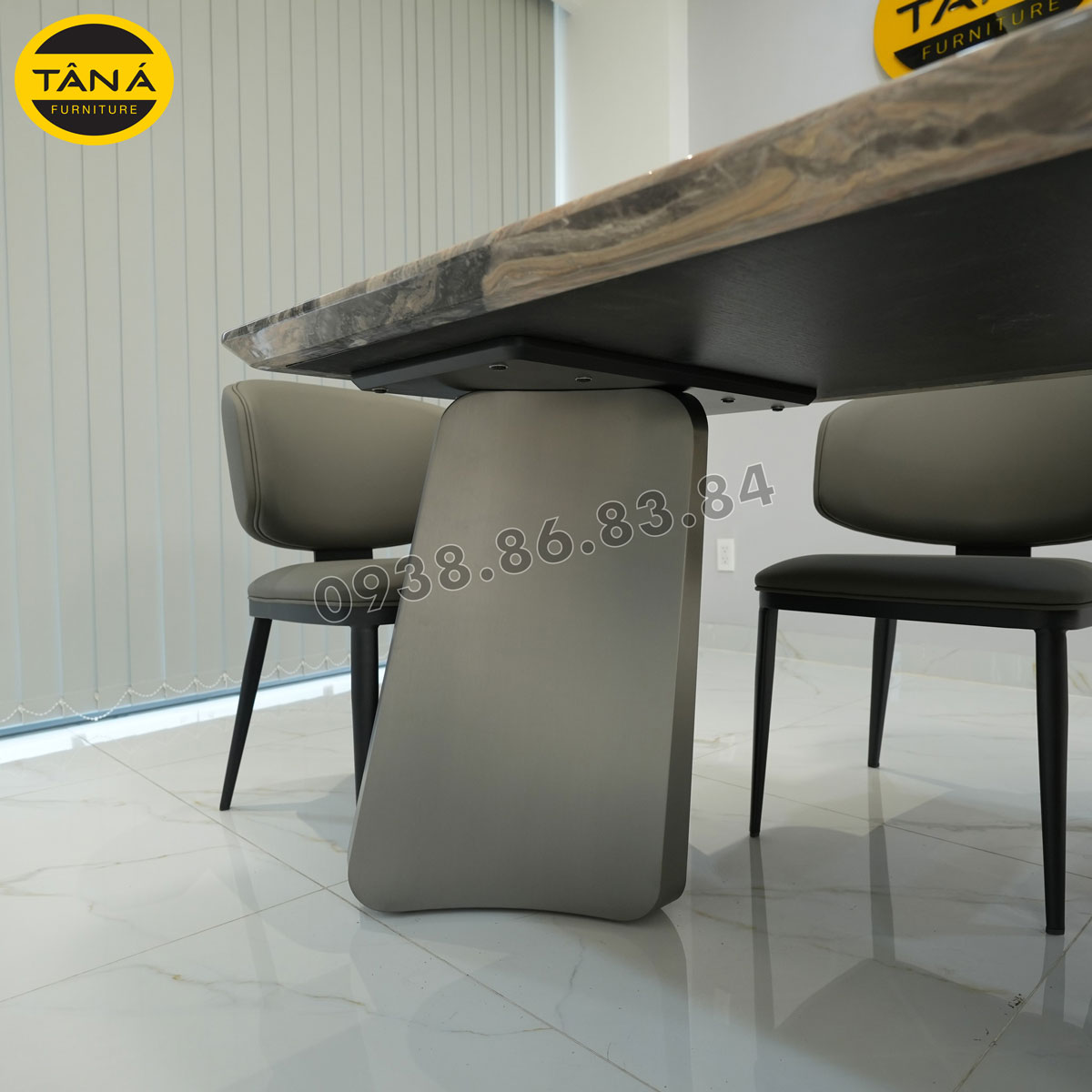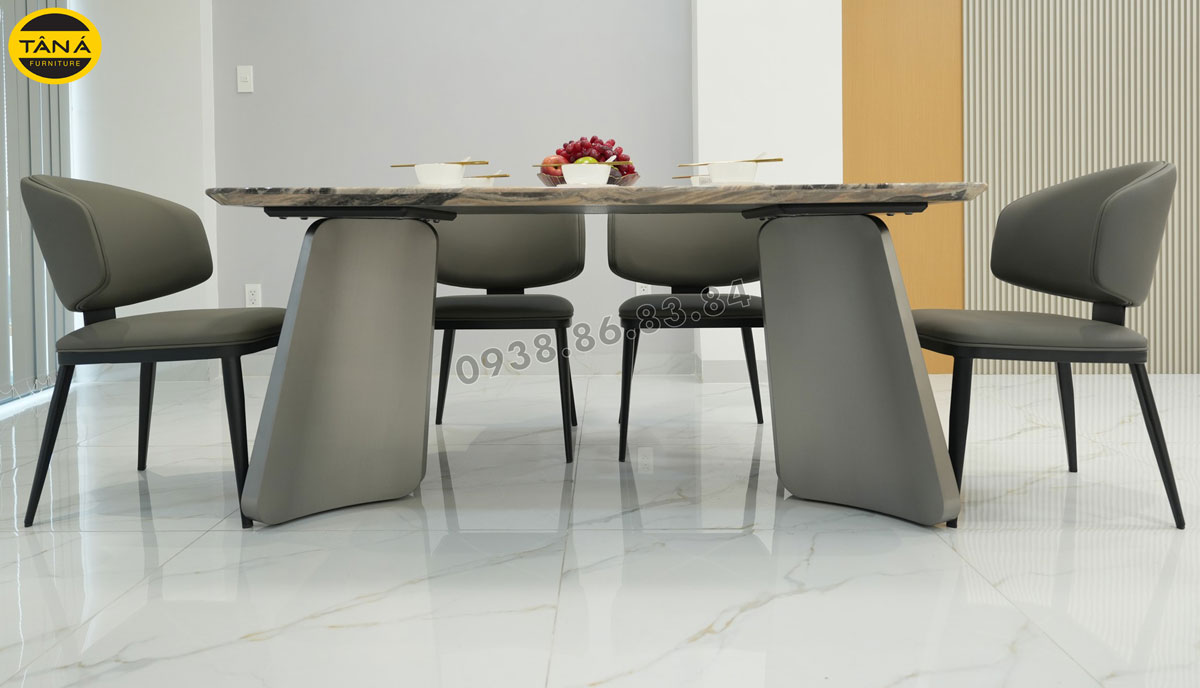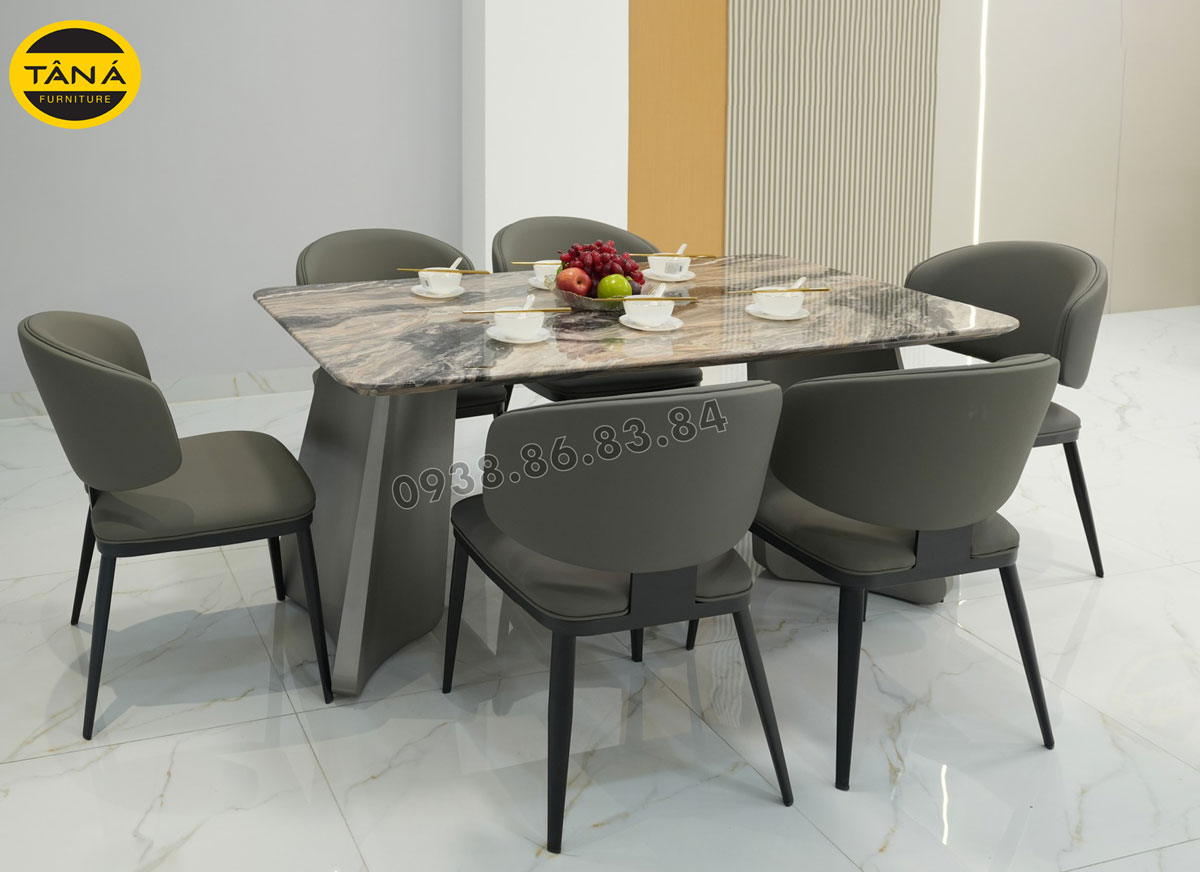 Phần chân bàn cũng là điểm nổi bật của bộ bàn ăn 6 ghế BA-KC07. Được làm từ sắt sơn tĩnh điện cao cấp, vừa đảm bảo độ bền vững chắc vừa mang đến vẻ đẹp hiện đại, thanh lịch. Những đường nét uốn lượn mềm mại, kết hợp hài hòa với mặt đá, tạo nên một bàn ăn hoàn hảo, vừa sang trọng vừa ấm cúng cho căn bếp của gia đình.