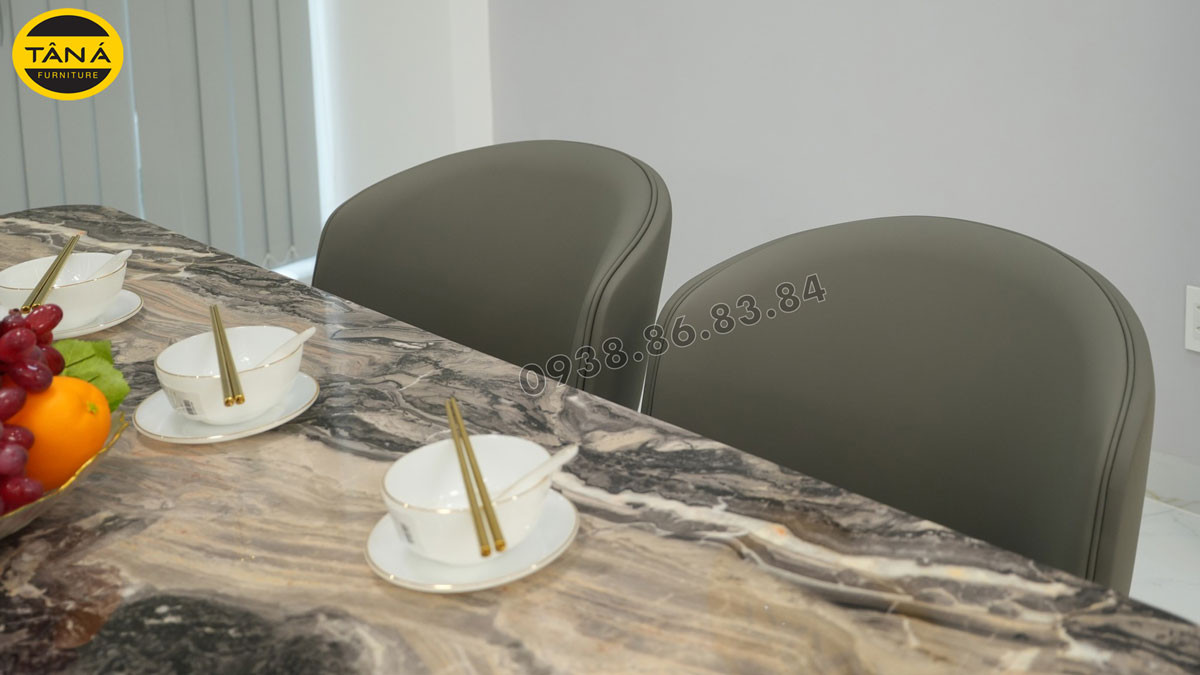 Đi kèm với bộ bàn ăn là 6 chiếc ghế được bọc da cao cấp, kiểu dáng tinh tế, thanh lịch. Không chỉ đem đến chỗ ngồi thoải mái, bộ ghế với gam màu trung tính hiện đại giúp tạo điểm nhấn nhẹ nhàng cho căn bếp của gia đình.