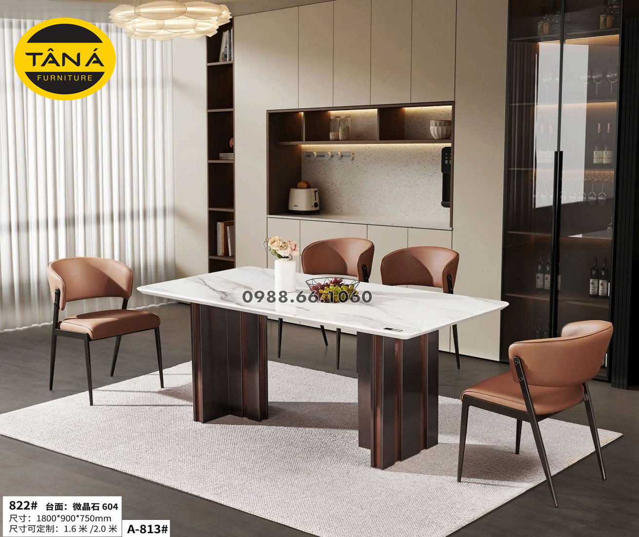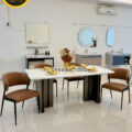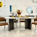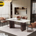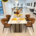 Nhìn từ ngoài bước vào, BA822 gây ấn tượng với mặt đá tự nhiên sáng, vân đá mềm, kết hợp cùng 6 ghế bọc da tông màu trung tính. Kích thước bàn ăn 1,8m x 90cm đủ lớn để trở thành điểm nhấn của phòng ăn nhưng không bị thô, đặc biệt khi đặt trong căn hộ từ khoảng 80 m² trở lên hay nhà phố có không gian bếp – phòng ăn liền kề.
