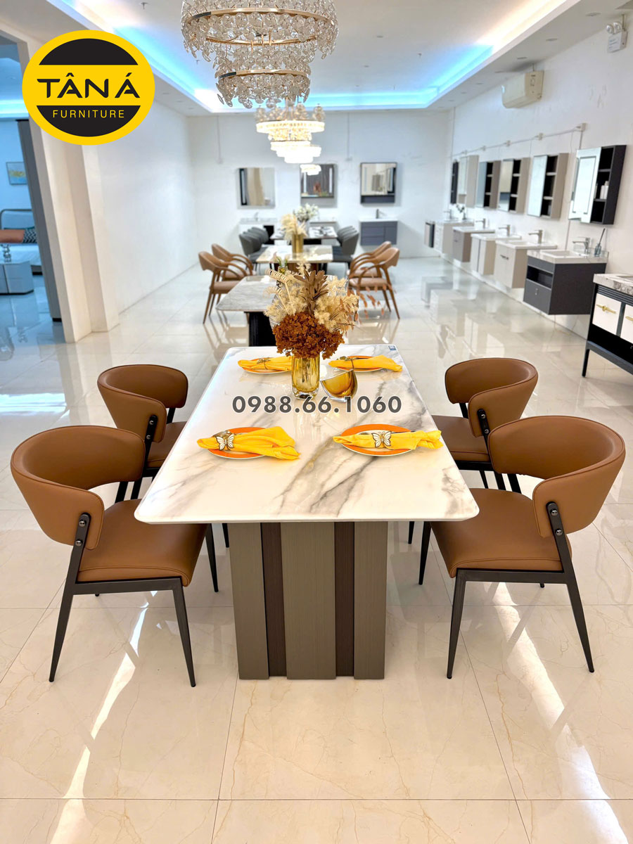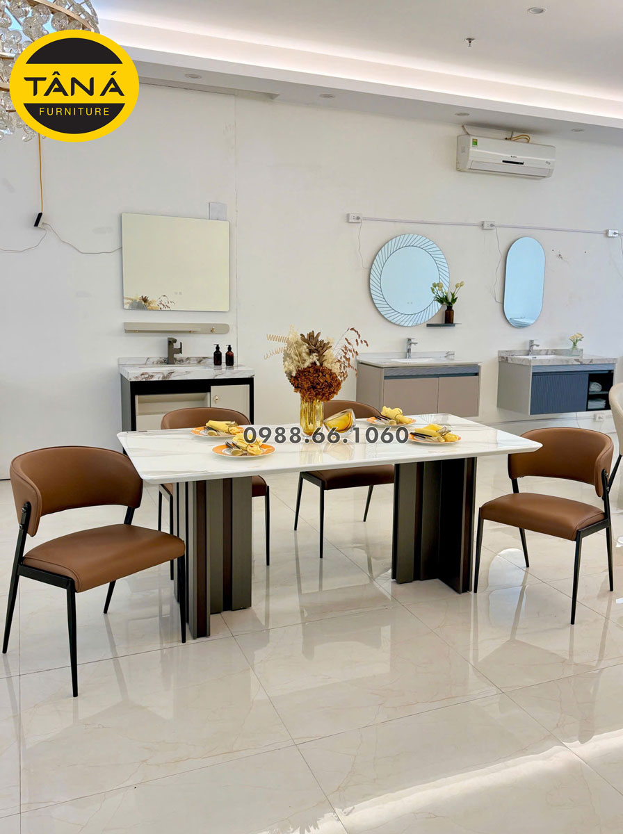 Khi hoàn thiện một căn hộ mới hay vừa sửa lại phòng bếp, câu hỏi thường gặp nhất là: nên chọn bộ bàn ăn nào để vừa đẹp, vừa dễ dùng mỗi ngày. Bộ Bàn Ăn Mặt Đá Tự Nhiên 1,8m + 6 Ghế Nhập Khẩu BA822 là một trong những mẫu đang được Nội Thất Tân Á ưu tiên trưng bày, với kích thước 1,8m x 90cm, mặt đá tự nhiên và 6 ghế bọc da cao cấp, chân kim loại chắc chắn.