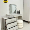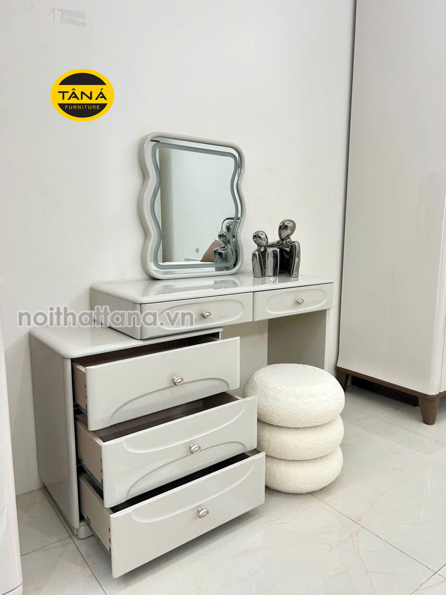 Sự đồng bộ đến từng chi tiết nhỏ như tay nắm ngăn kéo, chân bàn… tạo nên một tổng thể chuyên nghiệp cho căn phòng. Bàn phấn có gương lớn, giúp chị em thoải mái làm đẹp.