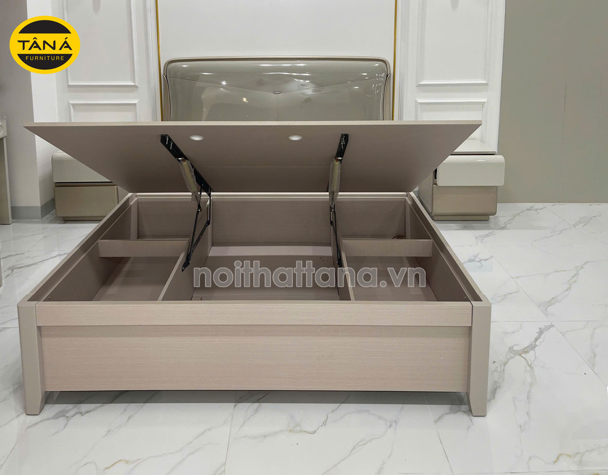 Kết cấu: Khung giường nhập khẩu cực kỳ chắc chắn. Quan sát kỹ phần gầm giường, Tân Á thiết kế gầm thoáng (không tích hợp hộc kéo sát đất). Điều này cực kỳ quan trọng để đảm bảo sự thông thoáng khí cho nệm và cốt gỗ, tránh ẩm mốc tuyệt đối – một tiêu chuẩn của nội thất cao cấp.