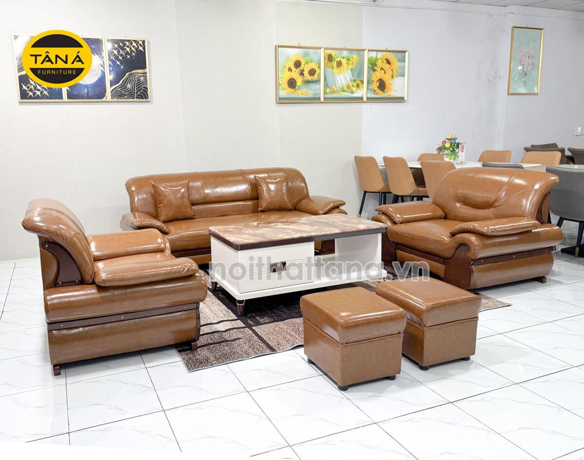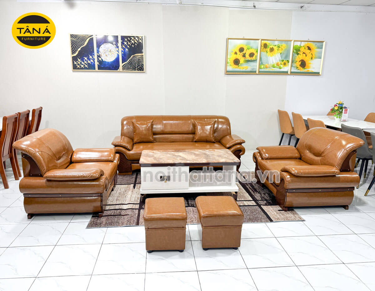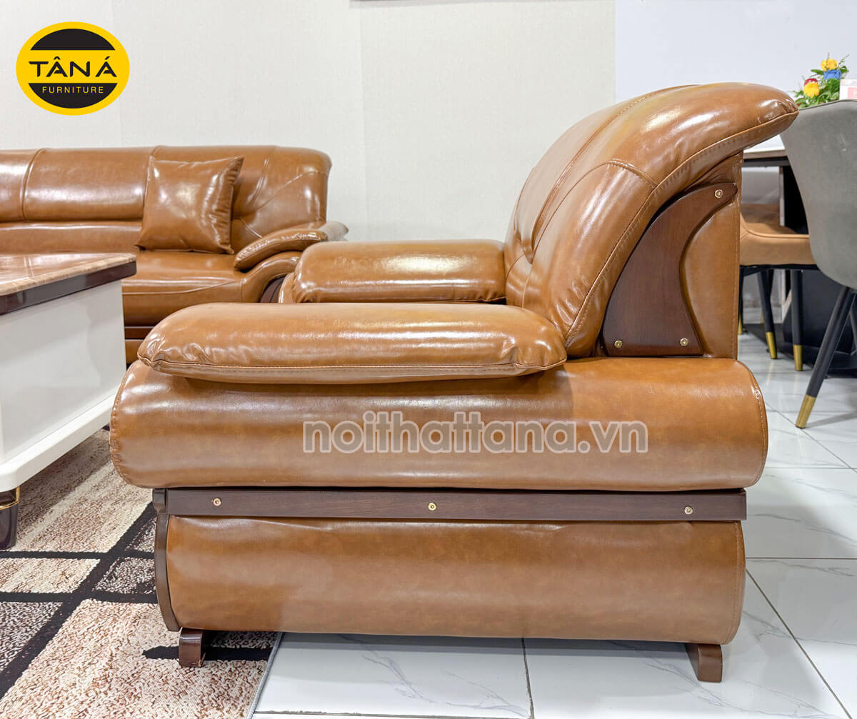 Về chất liệu, bộ sản phẩm được bọc da cao cấp. Đệm mút D40 chuẩn Hàn Quốc. Đảm bảo chống xẹp lún và có độ đàn hồi cao. Khung ghế sofa được làm từ gỗ tự nhiên vô cùng chắc chắn.